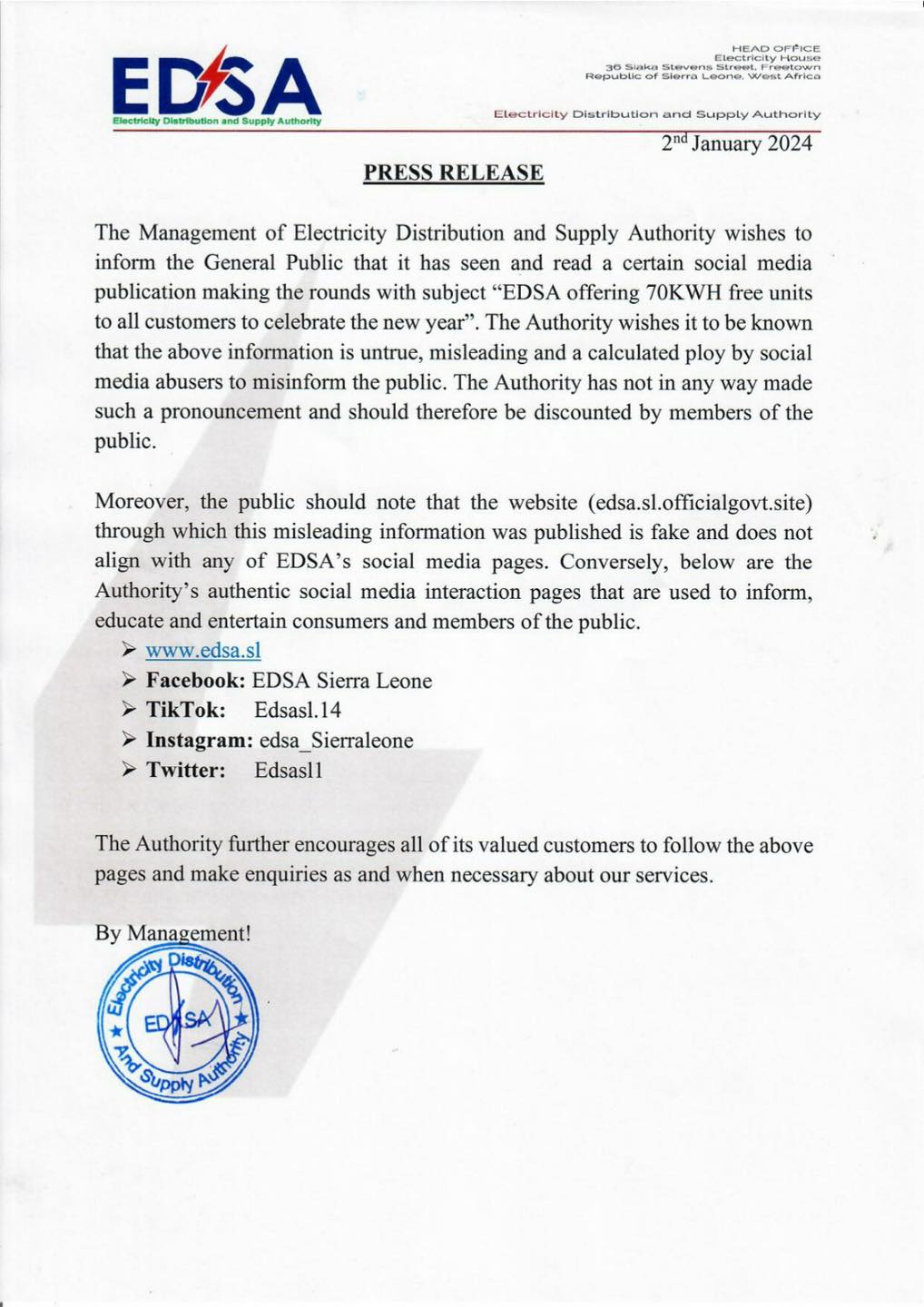 The Electricity Distribution and Supply Authority (EDSA) of Sierra Leone is urging the public to ignore misleading social media claims offering 70KWh free electricity as a New Year’s gift.