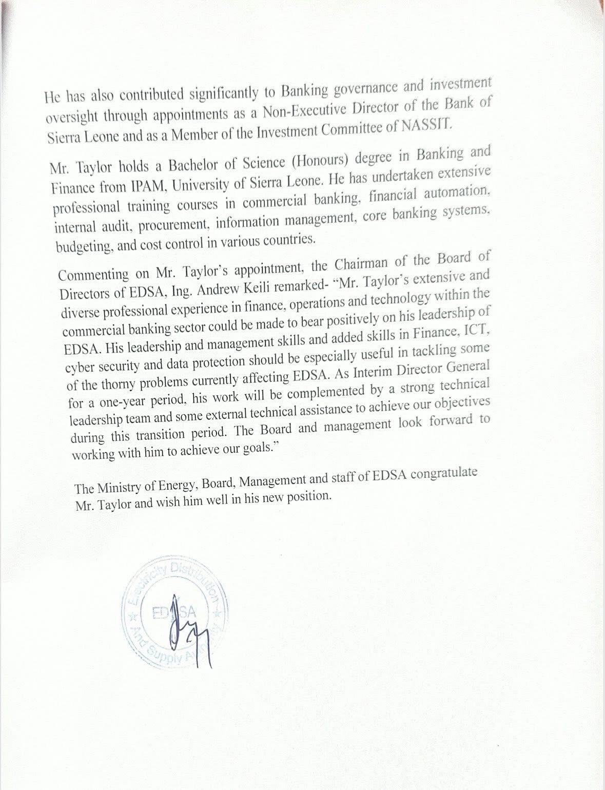 Before his appointment, Mr. Taylor had a long career at the Sierra Leone Commercial Bank (SLCB), where he rose to the position of Managing Director.