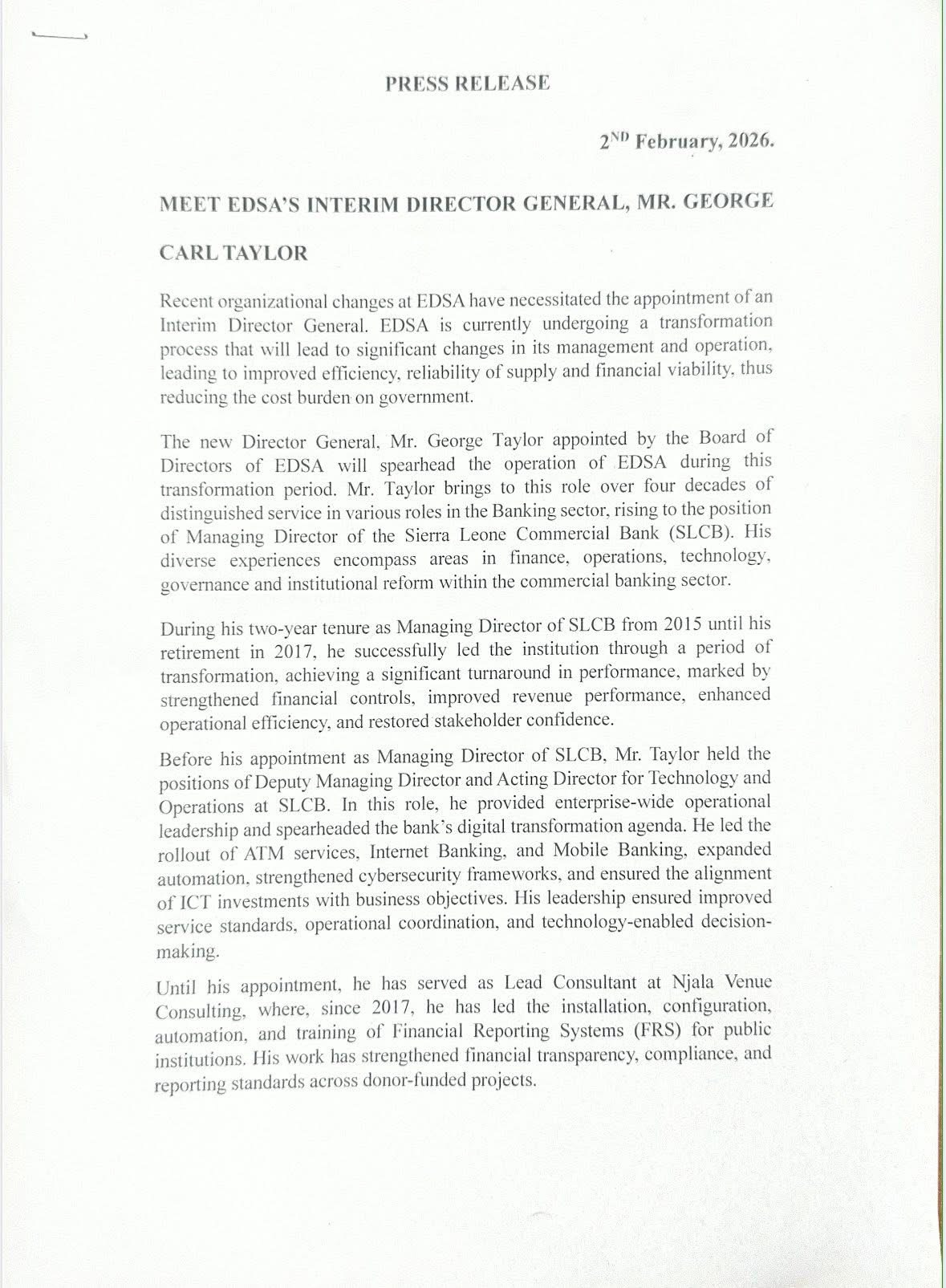 The Electricity Distribution and Supply Authority (EDSA) has appointed Mr. George Carl Taylor as its Interim Director General following recent organizational changes at the utility, according to an official press release issued on February 2, 2026.