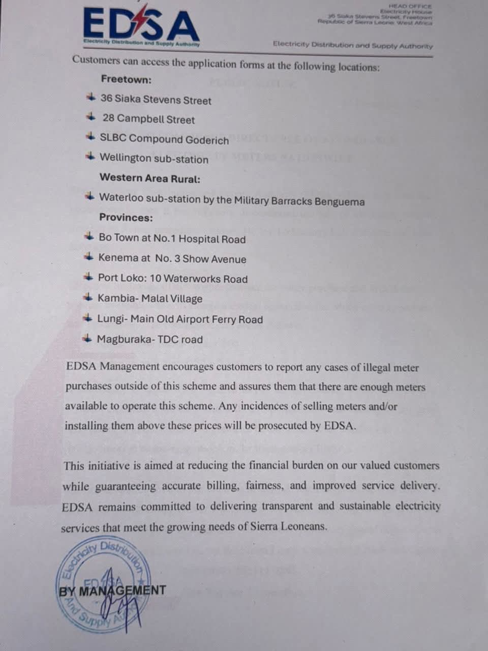 The Electricity Distribution and Supply Authority (EDSA) has announced major changes to the process of purchasing electricity meters in Sierra Leone, introducing a new direct-sale system aimed at making meters more affordable and improving customer service nationwide.