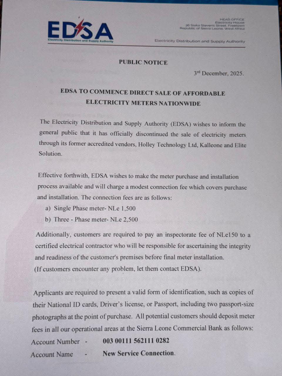 The Electricity Distribution and Supply Authority (EDSA) has announced major changes to the process of purchasing electricity meters in Sierra Leone, introducing a new direct-sale system aimed at making meters more affordable and improving customer service nationwide.