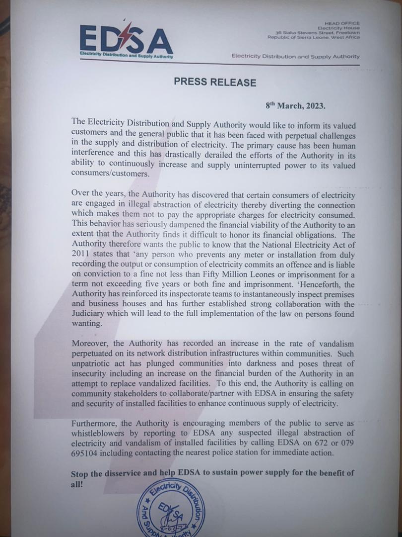 EDSA, therefore, wants the public to know that the National Electricity Act of 2011 states that, “Any person who prevents any meter or installation from duly recording the output or consumption of electricity commits an offense and is liable on conviction to a fine not less than Fifty Million Leones or imprisonment for a term not exceeding five years or both fine and imprisonment.”