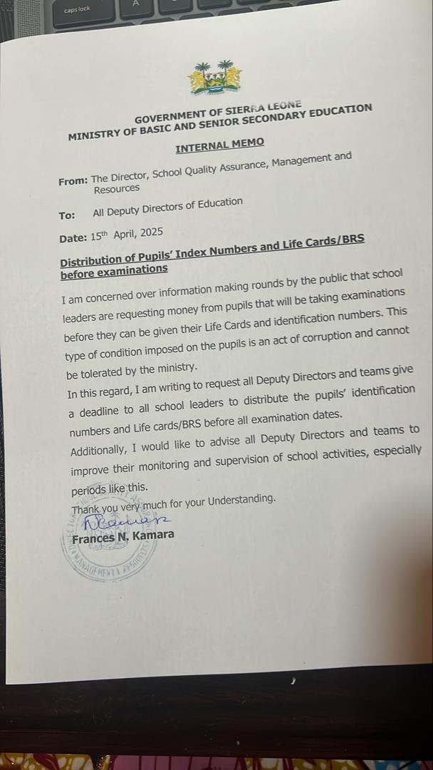 In an internal memo dated April 15, 2025, Frances N. Kamara, the Director of School Quality Assurance, Management and Resources within the Ministry, instructed all Deputy Directors of Education and their teams to set a firm deadline for school leaders to distribute pupils’ identification numbers and life cards/BRS before the commencement of any examinations.