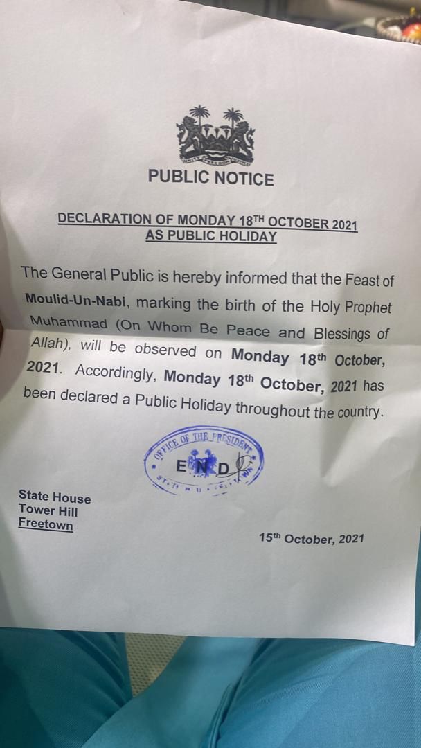 The Government of Sierra Leone has declared Monday, October 18, 2021 as Public Holiday to mark this year’s Eid-el-Maulud, the Islamic festival commemorating the birth of the Holy Prophet Muhammad (SAW).