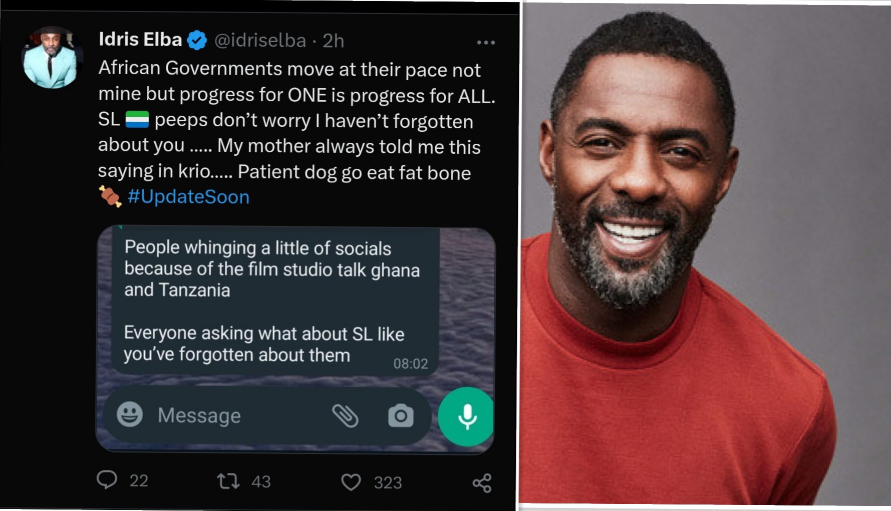 Sierra Leonean-British actor and musician, Idris Elba has stated that progress in one African country means progress for all, and assurred Sierra Leoneans that he has not forgotten about them.