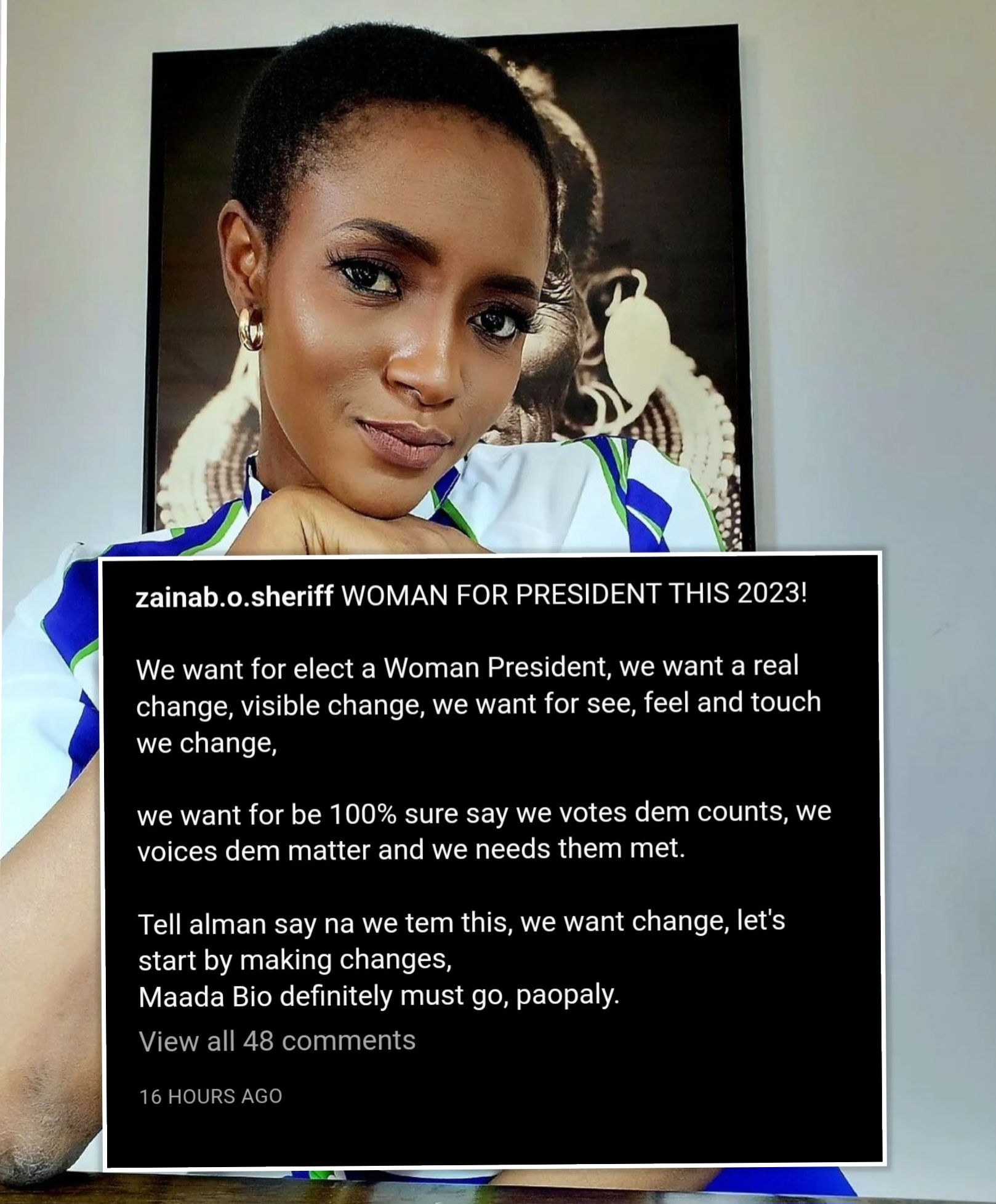 Sierra Leone sensational artiste, entrepreneur and CEO of Big Sister empowerment show, Zainab Sheriff has in a post on social media revealed her choice for the 2023 election.