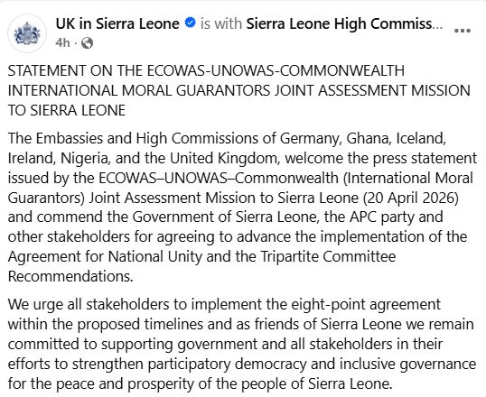 The Embassies and High Commissions of Germany, Ghana, Iceland, Ireland, Nigeria, and the United Kingdom have welcomed a press statement issued by the ECOWAS–UNOWAS–Commonwealth (International Moral Guarantors) Joint Assessment Mission to Sierra Leone following its visit on 20 April 2026.