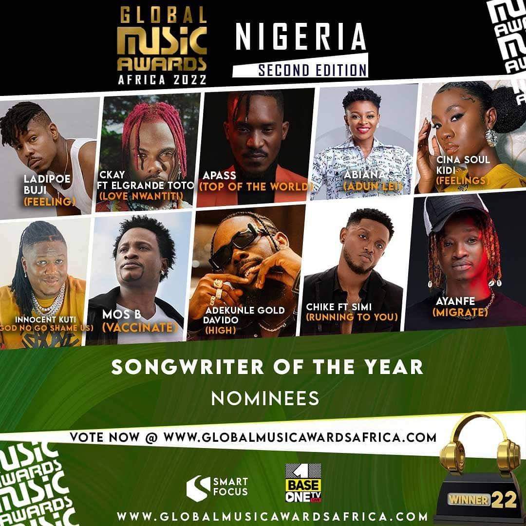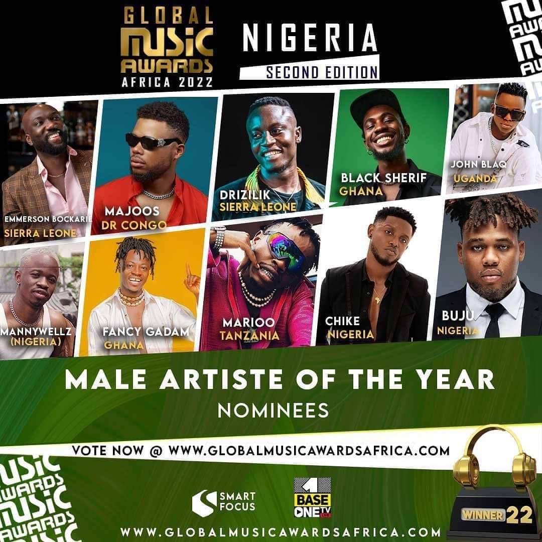 Emmerson received two nominations as Male Act of The Year along with Buju, Chike, Drizilik, Majoos, Black Sheriff, Fancy Gadam, Marioo and Mannywellz and Afrobeat Song of The Year along with Adekunle Gold, Burna Boy, Olakira, Rozzy, Spinall and others.