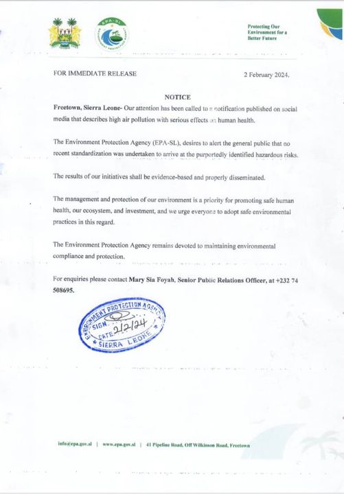 The Environmental Protection Agency (EPA) has on the 2nd February 2024 in a Press Release that their attention has been called to a notification published on social media that describes high air pollution with serious effects on human health in the country.