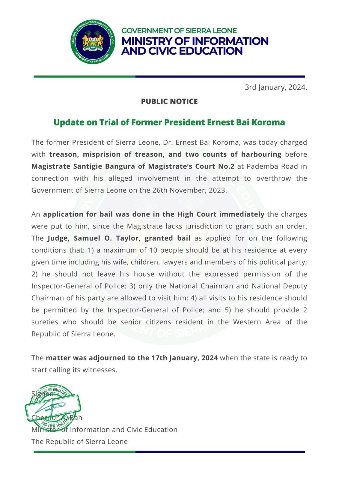 Former President Dr. Ernest Bai Koroma faced charges of treason, misprision of treason, and harbouring in connection with his alleged role in the failed coup attempt on November 26th, 2023. Dr. Ernest Bai Koroma, Bail Granted Under Strict Conditions.