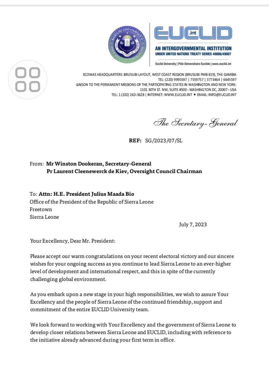 We look forward to working with Your Excellency and the government of Sierra Leone to develop closer relations between Sierra Leone and EUCLID, including with reference to the initiative already advanced during your first term in office.