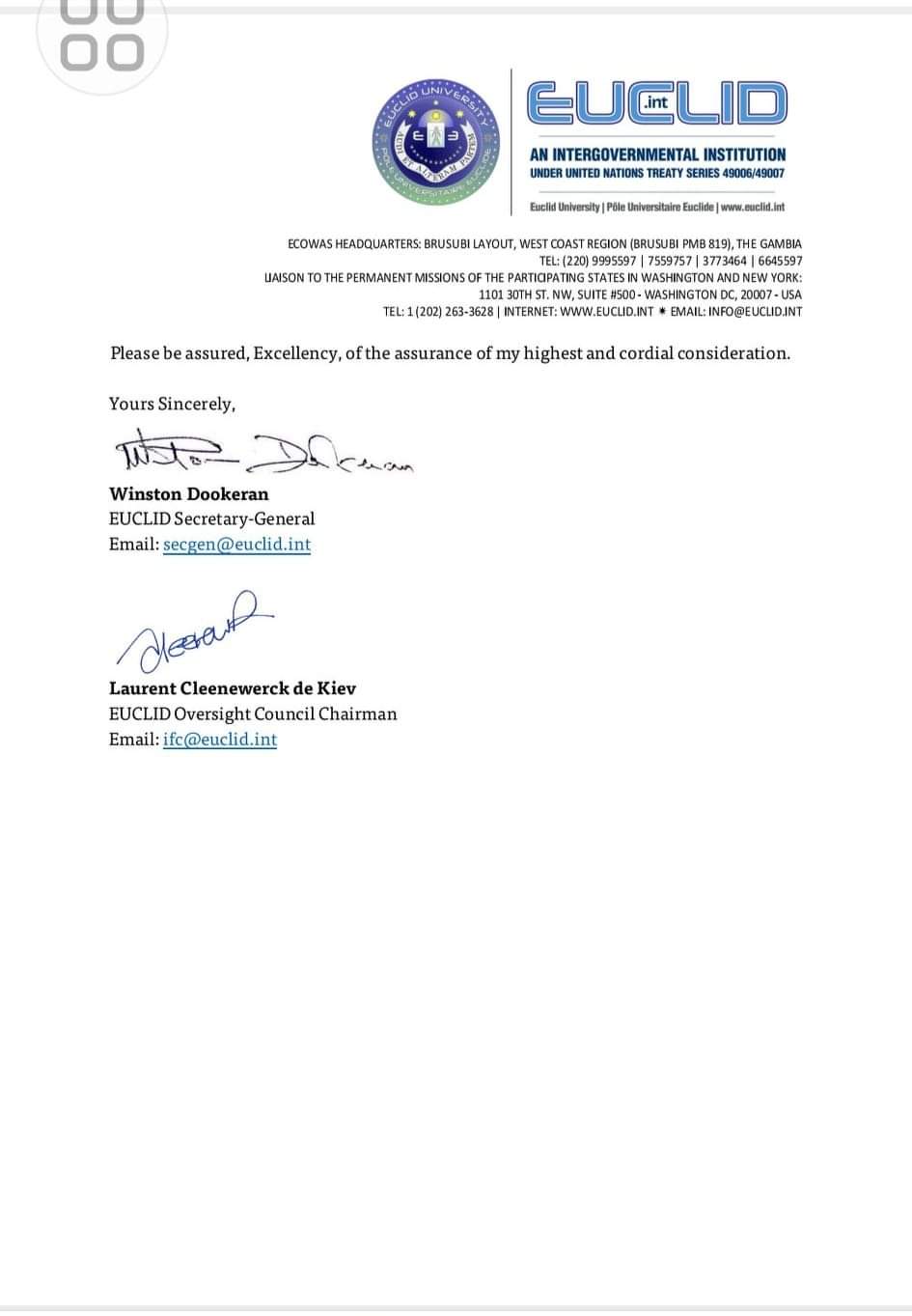 EUCLID university is an international intergovernmental organization with university mandate that offers to select students from the general public its flagship external (distance or online) degree program called the EUCLID Online Doctorate in Diplomacy and International Affairs (DDIA).