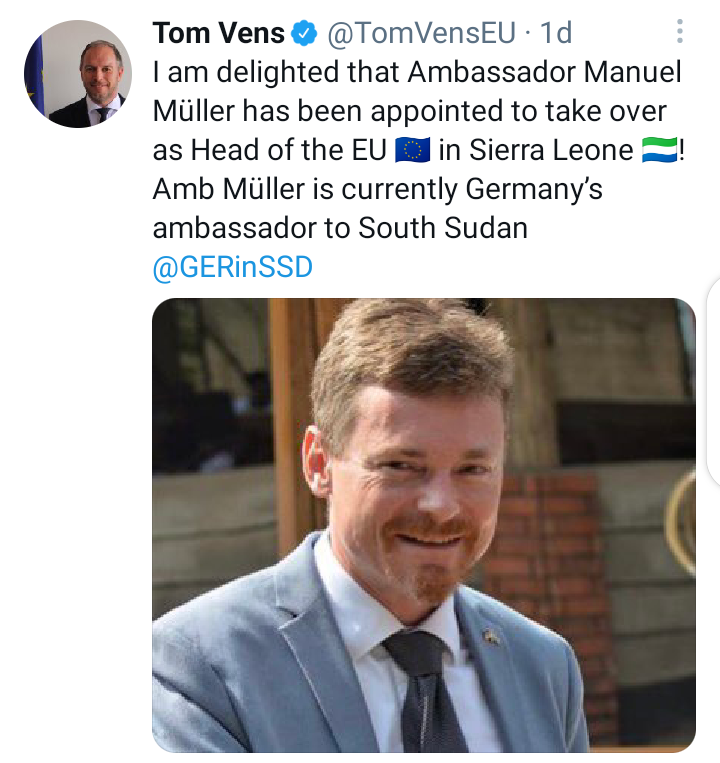 The outgoing Ambassador Tom Vens Tweeted, “I am delighted that Ambassador Manuel Müller has been appointed to take over as Head of the EU in Sierra Leone Amb Müller is currently Germany’s ambassador to South Sudan.”