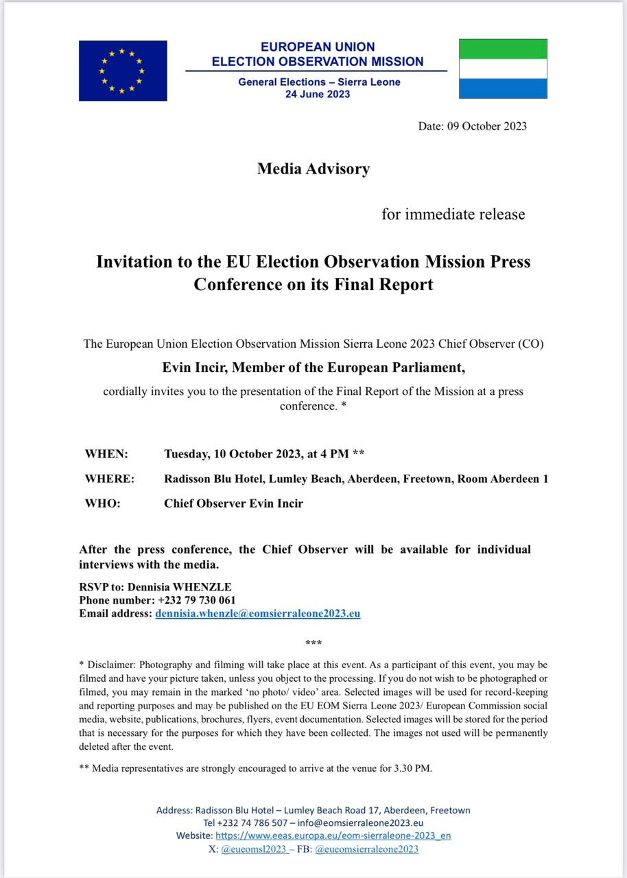 The European Union Election Observation Mission (EU EOM) is preparing to reveal its Final Report and Recommendations concerning the 2023 General Elections in Sierra Leone today, October 10, 2023.