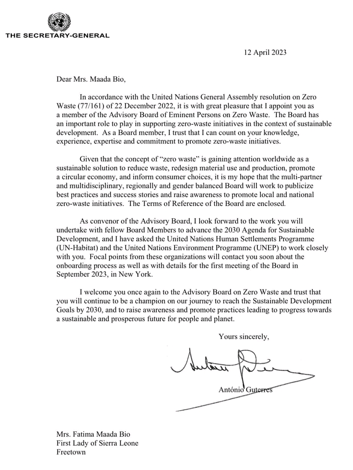 Sierra Leone’s First Lady Fatima Bio has been appointed by the United Nations Secretary-General, Antonio Guterres to the advisory board of eminent persons to promote Zero Waste Initiative to advance the UN 2030 agenda for sustainable development.