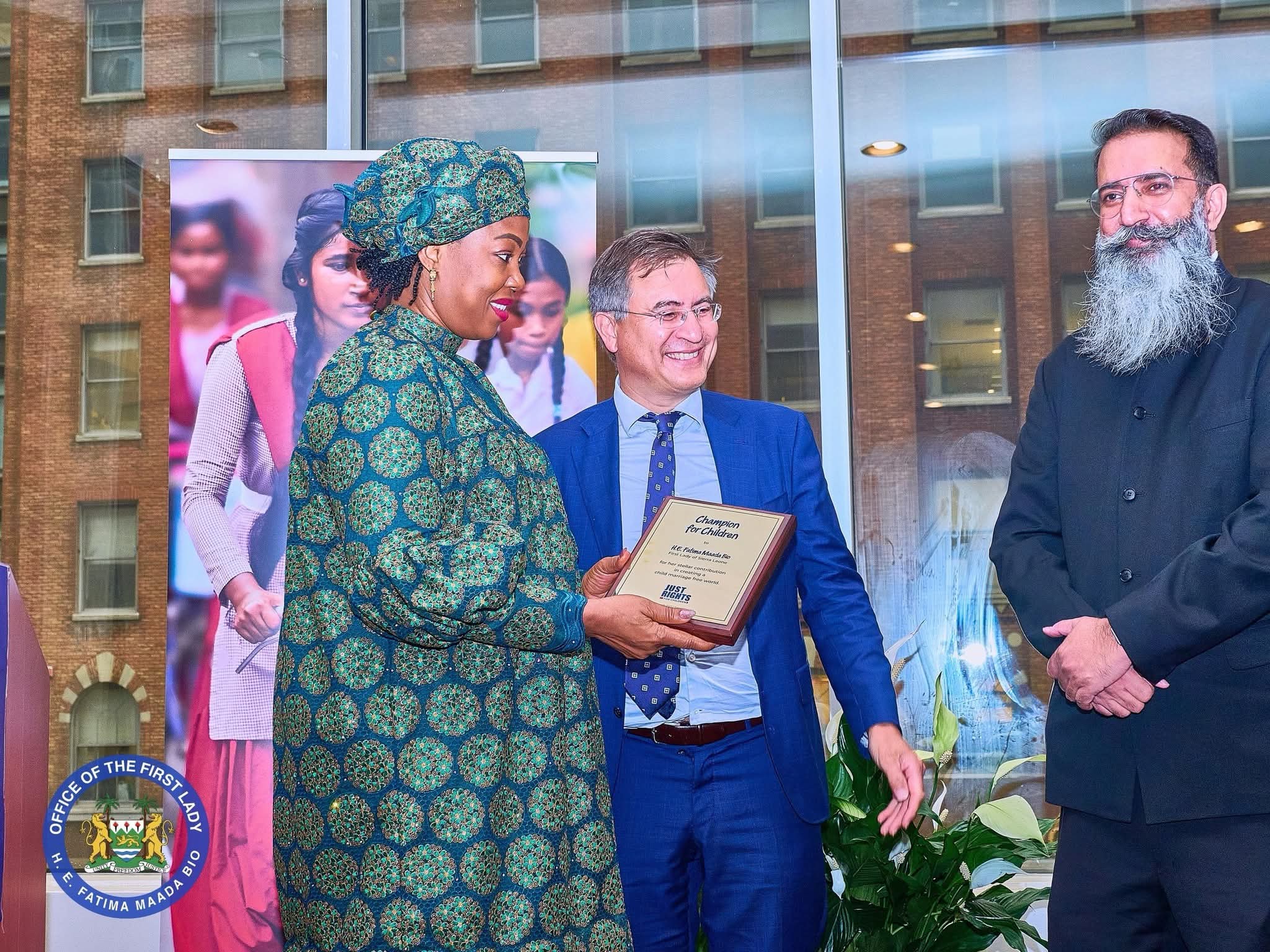 First Lady of Sierra Leone, Madam Fatima Maada Bio, has been awarded the Just Right Champion of Change Award at a high-level event on child marriage, organized by Just Right for Children (JRC), on the sidelines of the 80th Session of the United Nations General Assembly (UNGA) in New York City.