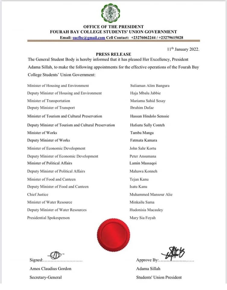 The President of the Fourah Bay College Students’ Union Government, Adama Sillah has announced the appointment of her cabinet members. She issued out a press Release which entails full names of the appointees.
