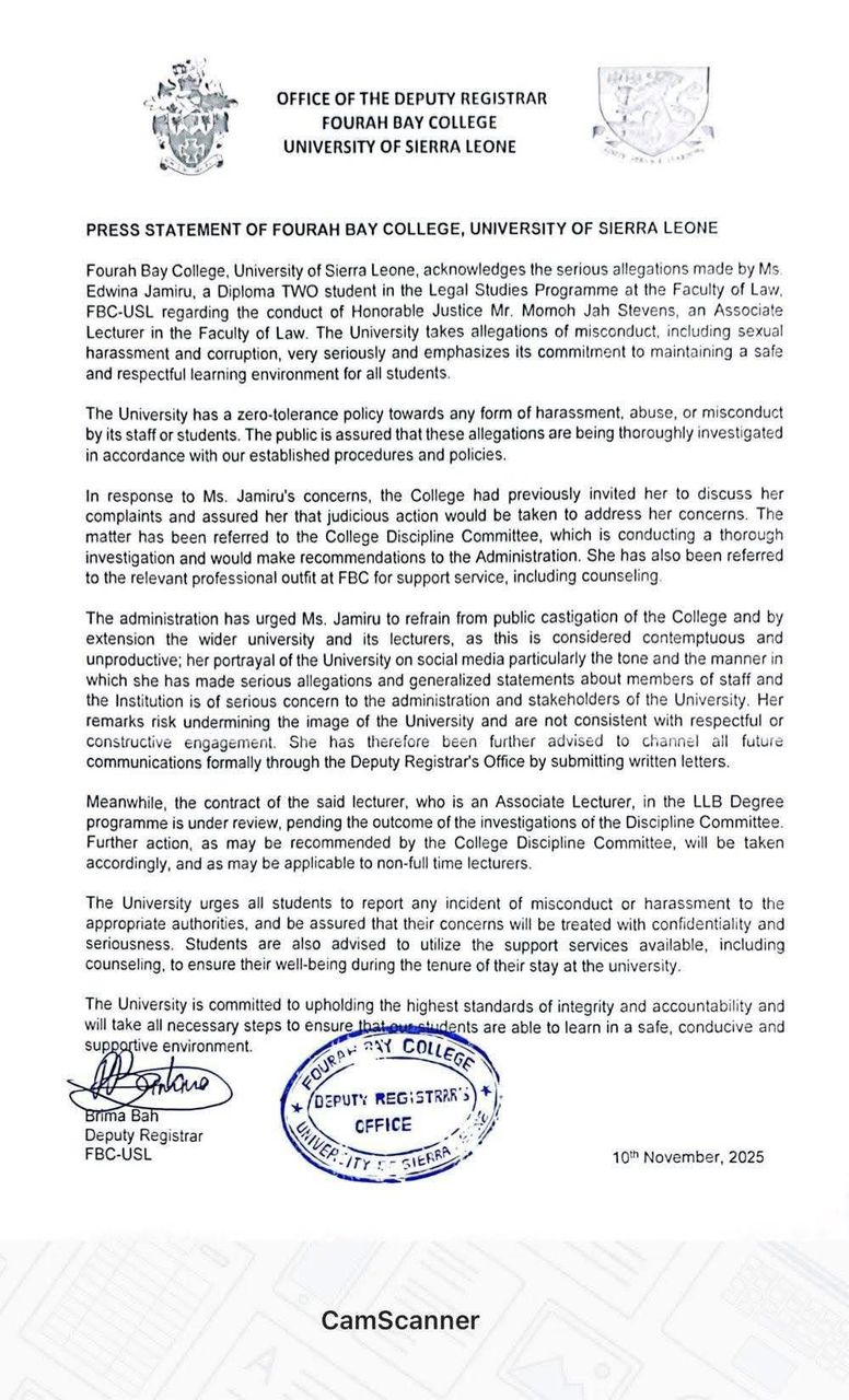 In a press statement dated November 10, 2025, and signed by Deputy Registrar Brima Bah, the University confirmed it takes the claims “very seriously” and emphasized its “zero-tolerance policy towards any form of harassment, abuse, or misconduct.” The statement assured the public that a “thorough investigation” is underway by the College Discipline Committee.