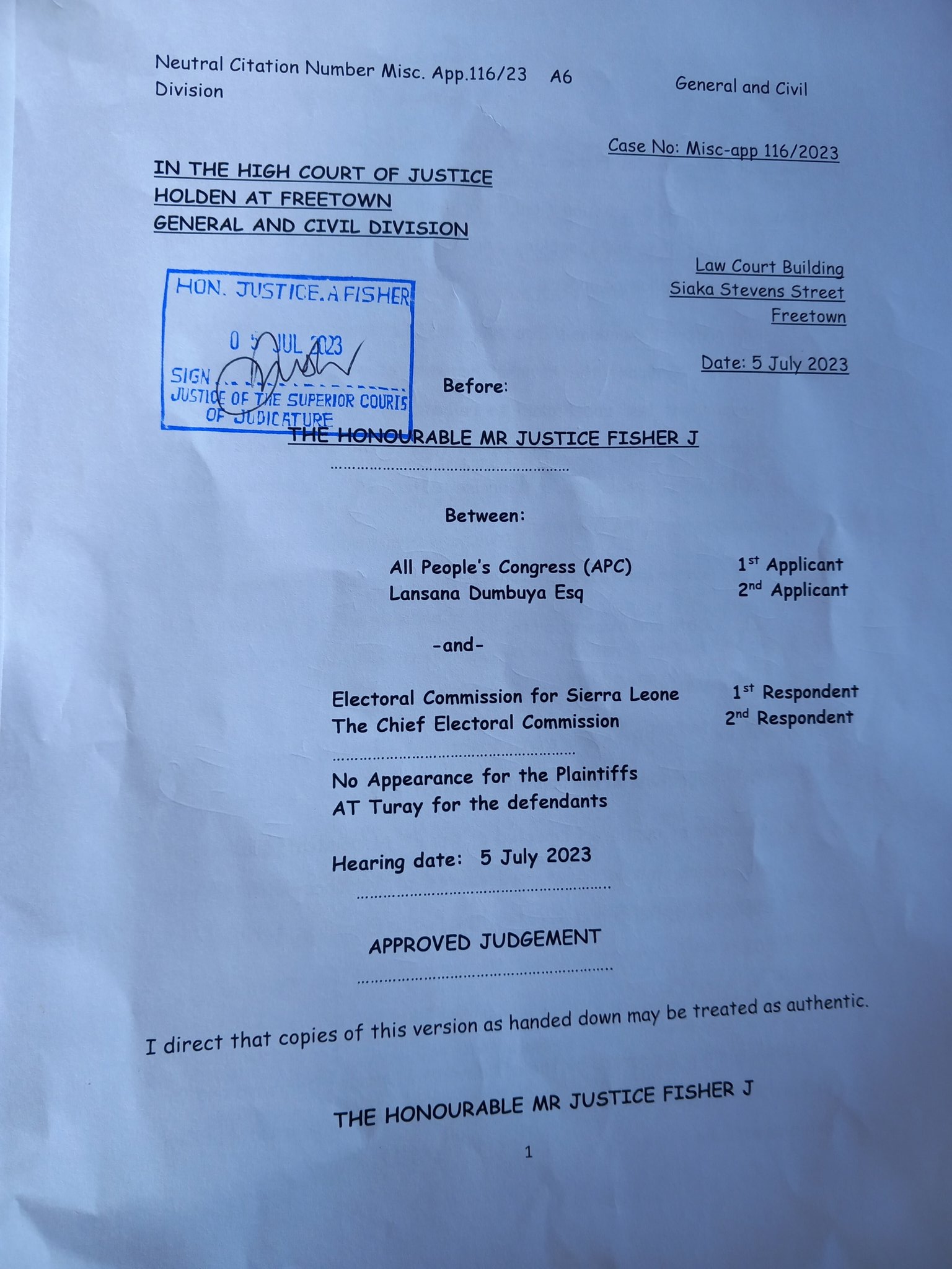 High Court Judge, Hon. Justice Adrian Fisher, has ruled in favor of the Electoral Commission for Sierra Leone (ECSL) and dismissed the legal action brought by the main opposition party, All People’s Congress (APC).