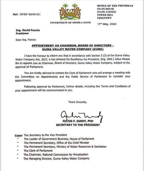 President Julius Maada Bio has appointed Ing. David Karim Fonnie as the new Chairman, Board of Directors Guma Valley Water Company (GVWC) subject to parliament’s approval.