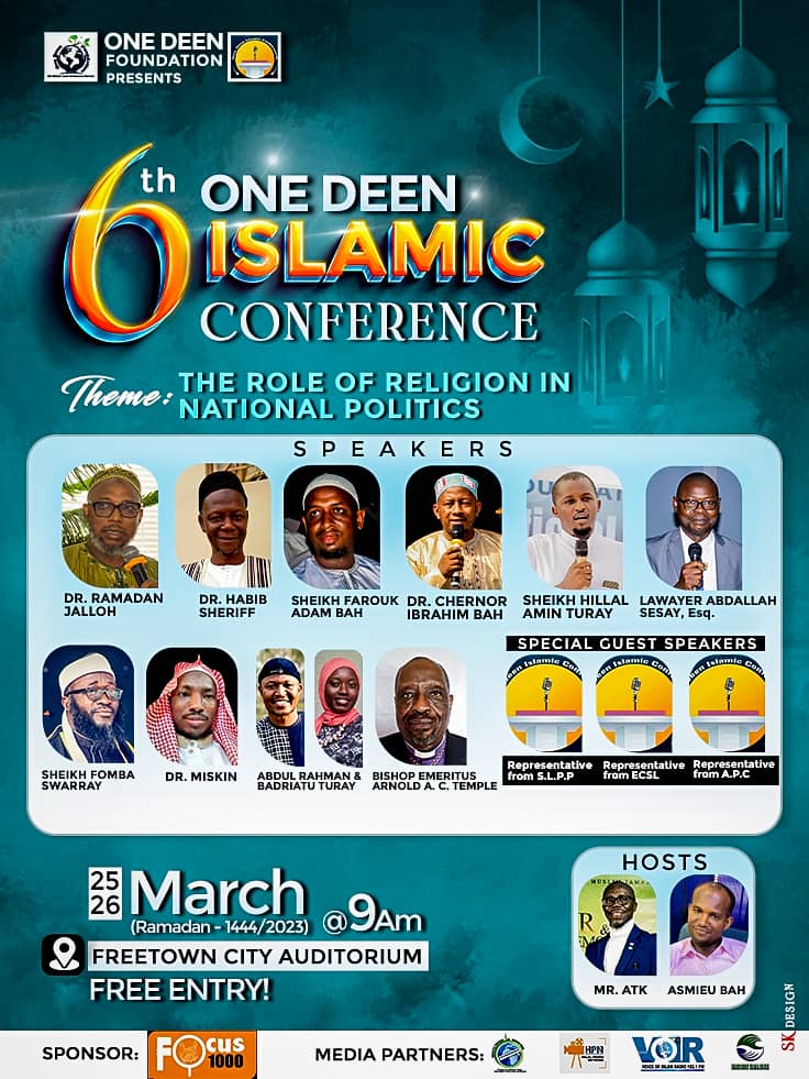 Prominent Islamic organization in the country, One Deen Foundation is set to hold its 6th edition of the One Deen Islamic Conference on the 25th and 26th of March 2023 at the Freetown City Auditorium.