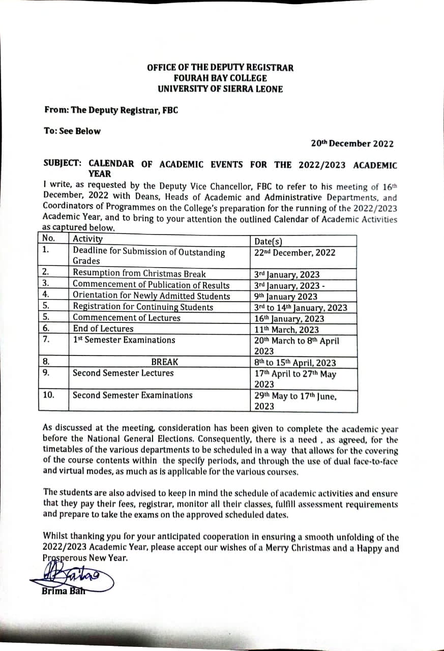 Fourah Bay College, University of Sierra has on the Tuesday 20th December, 2022 unveiled the 2022/2023 academic year University timetable.