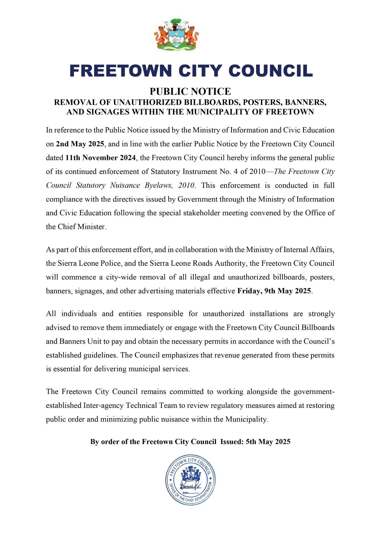 The Freetown City Council (FCC) has announced plans to begin the removal of unauthorized billboards, posters, banners, and signage across the city starting Friday, 9th May 2025.