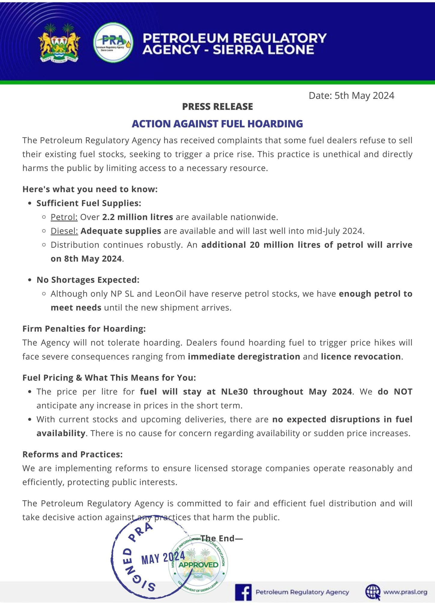 The statement confirmed that currently, only NP SL and Leon Oil have reserve petrol stocks. However, the PRA emphasizes that these reserves, combined with the upcoming shipment, are sufficient to meet demand until the next major delivery.