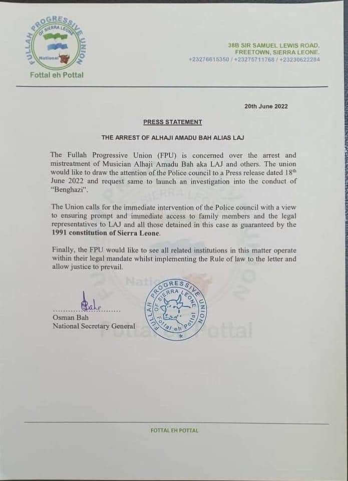 The Fullah Progressive Union (FPU) is concerned over the arrest and mistreatment of Musician Alhaji Amadu Bah aka LAJ and others.
