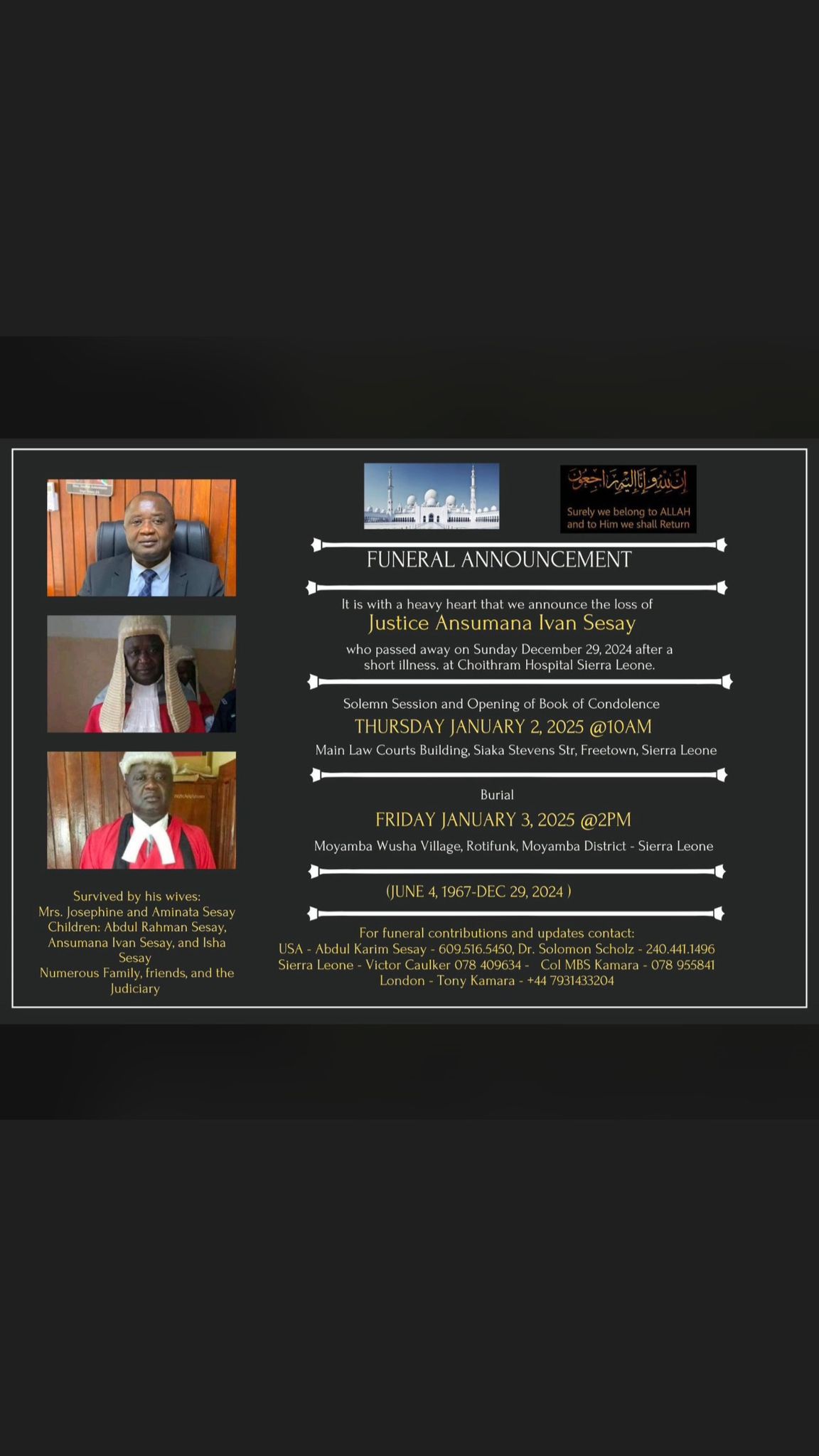 The Judiciary of Sierra Leone has announced the funeral arrangements for the late Justice Ansumana Ivan Sesay, who passed away on Sunday, December 29, 2024, after a short illness at Choithram Hospital.