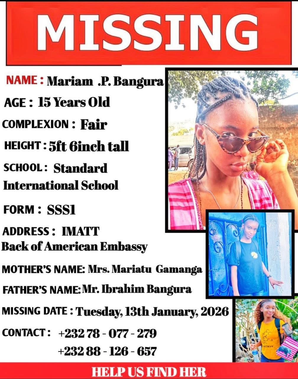 A 15-year-old schoolgirl, Mariam P. Bangura, has been missing for more than a week, prompting her family to renew calls for public assistance and police support to help locate her.
