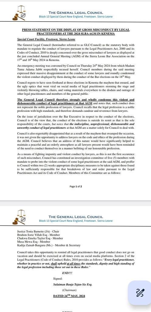 The General Legal Council (GLC), the statutory body mandated to regulate the conduct of lawyers in Sierra Leone, has issued a stern statement condemning the gross misconduct displayed by legal practitioners at the recently concluded Annual General Meeting (AGM) of the Sierra Leone Bar Association (SLBA).