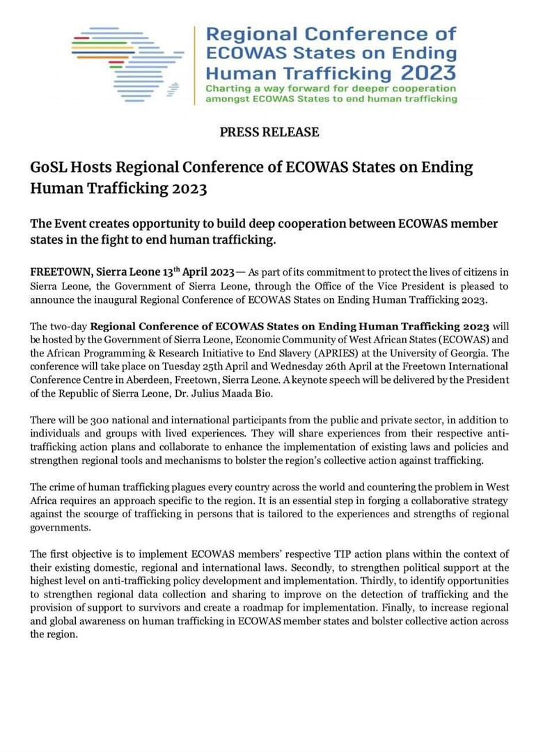 ”FREETOWN, Sierra Leone 13th April 2023-As part of its commitment to protect the lives of citizens in Sierra Leone, the Government of Sierra Leone, through the Office of the Vice President is pleased to announce the inaugural Regional Conference of ECOWAS States on Ending Human Trafficking 2023.