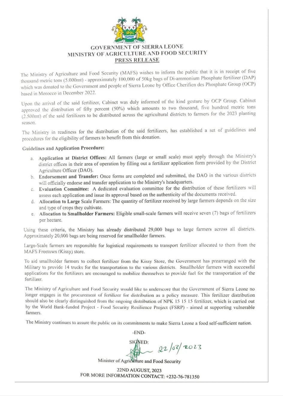 The release reads; The Ministry of Agriculture and Food Security (MAFS) wishes to inform the public that it is in receipt of five thousand metric tons (5.000mt)- approximately 100,000 of 50kg bags of Di-ammonium Phosphate fertilizer (DAP) which was donated to the Government and people of Sierra Leone by Office Cherifien des Phosphate Group (OCP) based in Morocco in December 2022.
