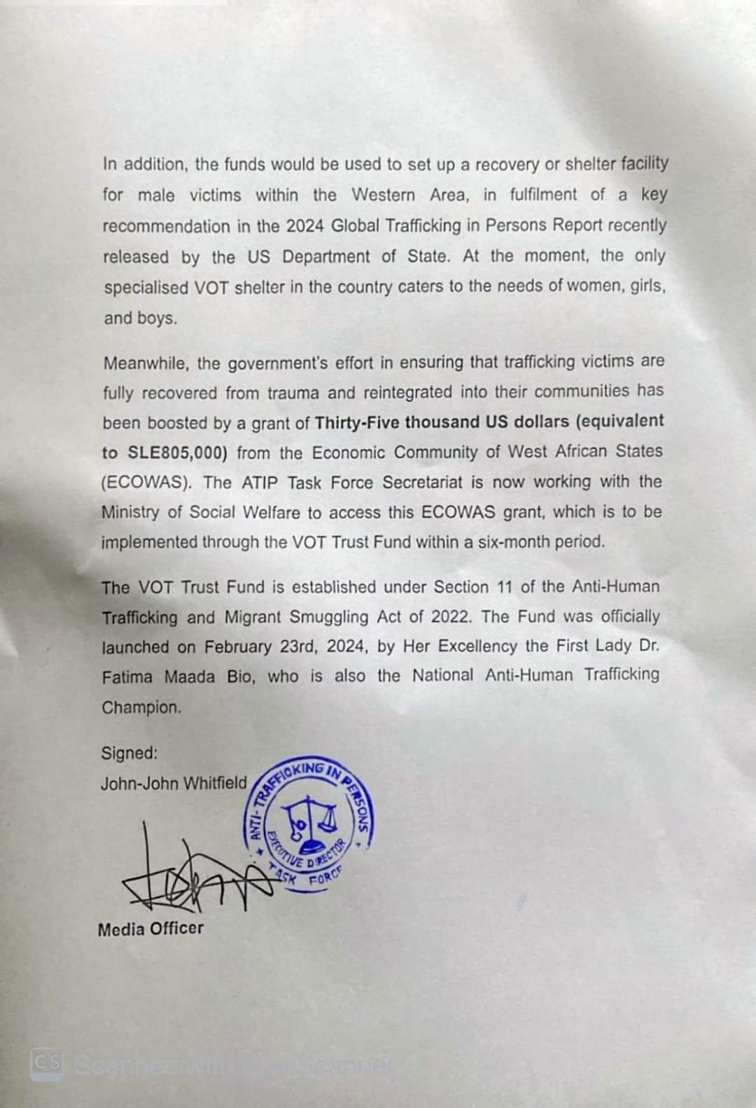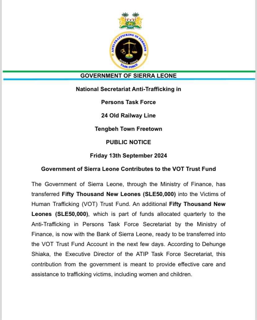 The Government of Sierra Leone, through the Ministry of Finance, has reinforced its commitment to supporting victims of human trafficking by transferring Fifty Thousand New Leones (SLE50,000) into the Victims of Human Trafficking (VOT) Trust Fund.
