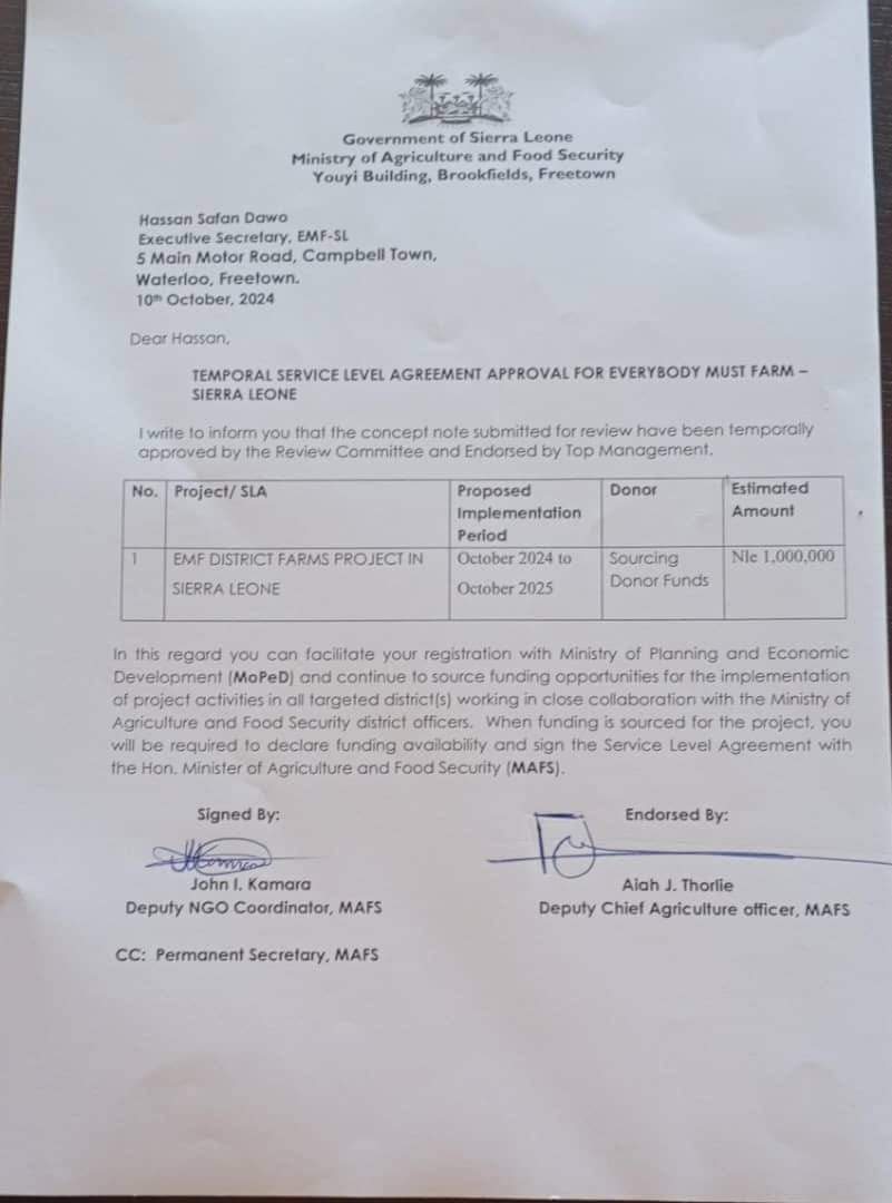 The letter, titled “Temporary Service Level Agreement Approval for Everybody Must Farm – Sierra Leone,” indicates that the proposal has been endorsed by the Review Committee and top management.