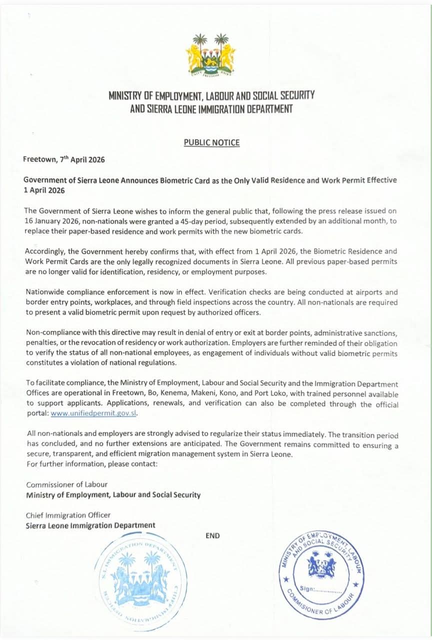 The Government of Sierra Leone has commenced full enforcement of biometric residence and work permits as the only legally recognized documents for non-nationals in the country, effective April 1, 2026.