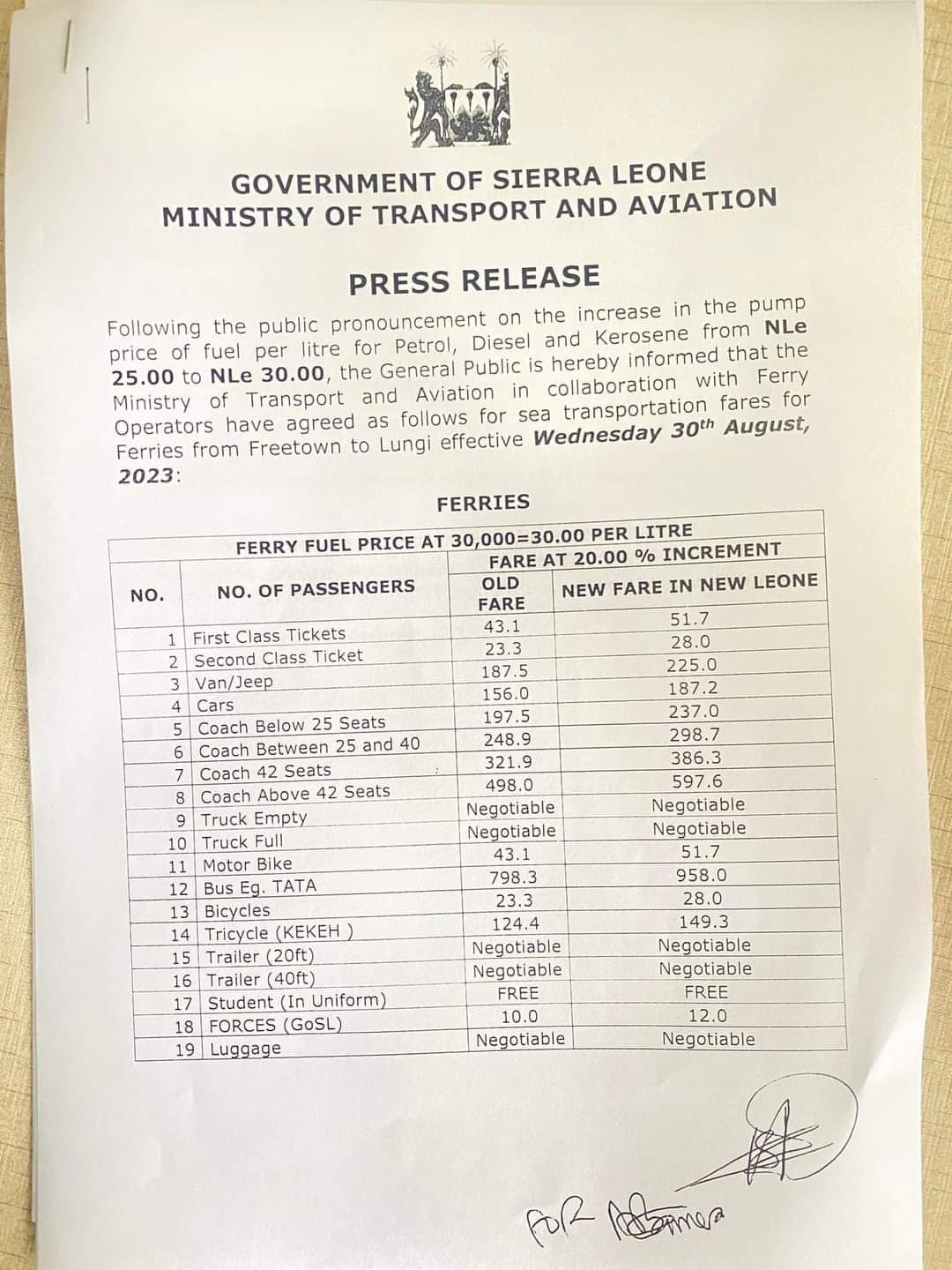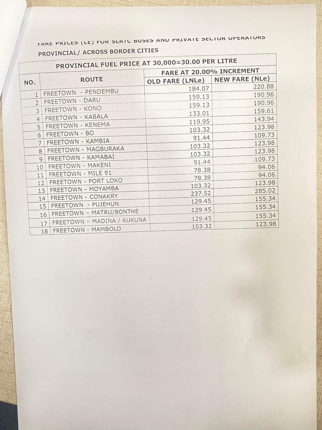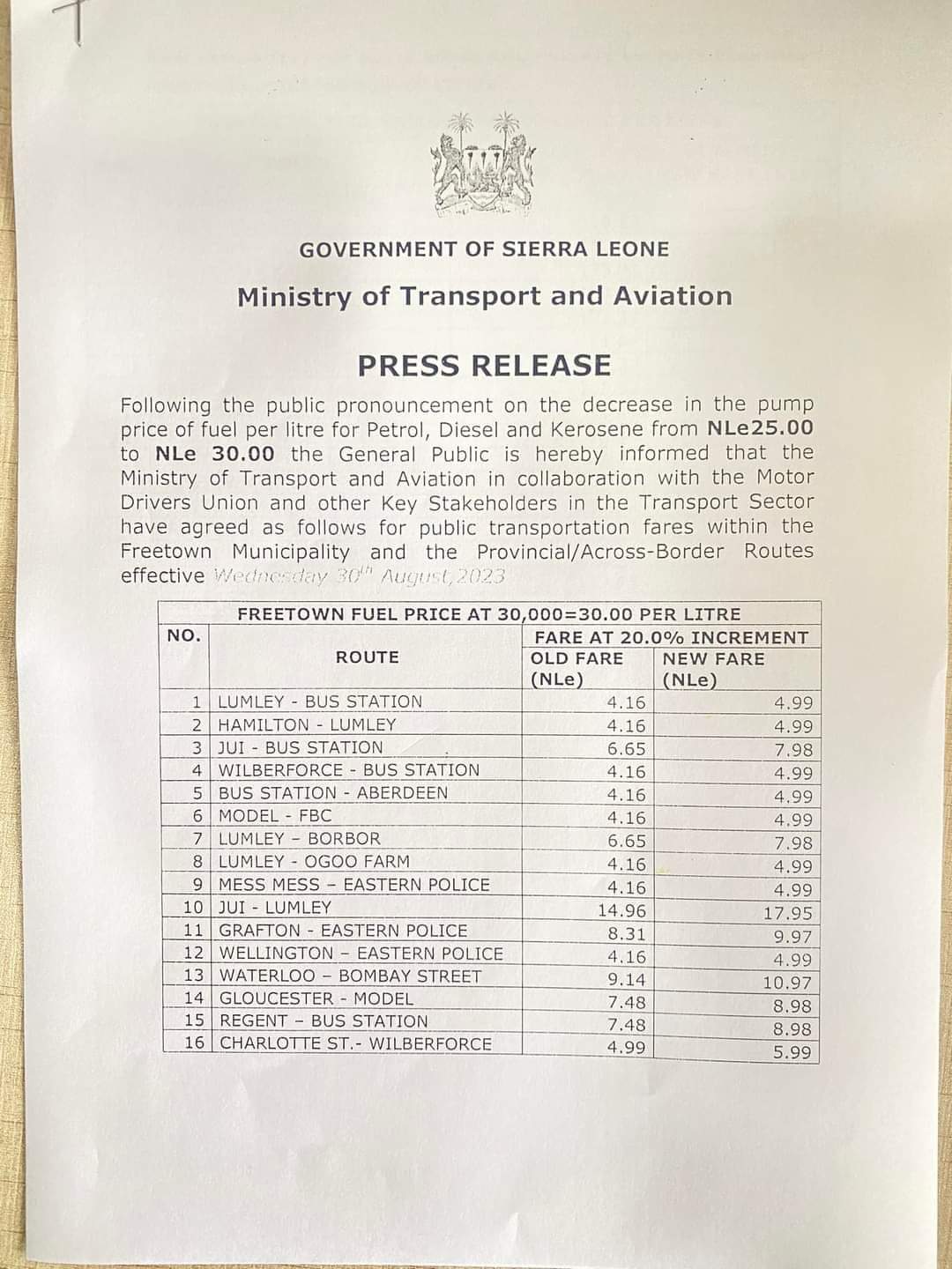 Following the public pronouncement on the Increase in the pump price of fuel per litre for Petrol, Diesel and Kerosene from NLe25.00 to NLe 30.00 the General Public is hereby informed that the Ministry of Transport and Aviation in collaboration with the Motor Drivers Union and other Key Stakeholders in the Transport Sector have agreed as follows for public transportation fares within the Freetown Municipality and the Provincial/Across-Border Routes effective Wednesday 30 August 2023