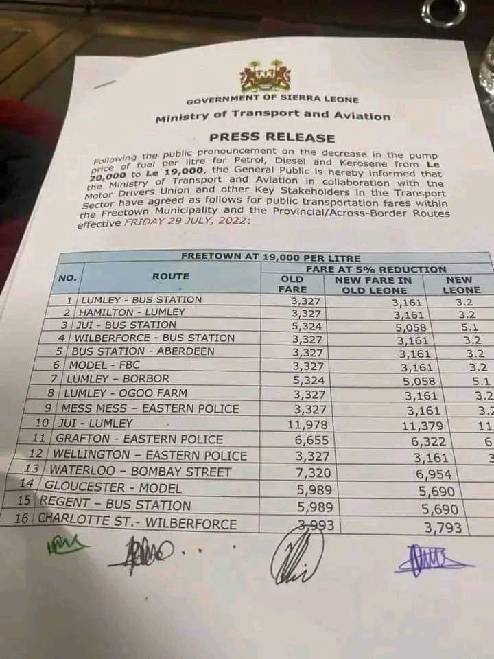 “Following the public pronouncement on the decrease in the pump price of fuel per litre for Petrol, Diesel and Kerosene from Le 20,000 to Le 19,000, the General Public is hereby informed that the Ministry of Transport and Aviation in collaboration with the Motor Drivers Union and other Key Stakeholders in the Transport Sector have agreed as follows for public transportation fares within the Freetown Municipality and the Provincial/Across-Border Routes effective FRIDAY 29 JULY, 2022:” the Government pronounced.