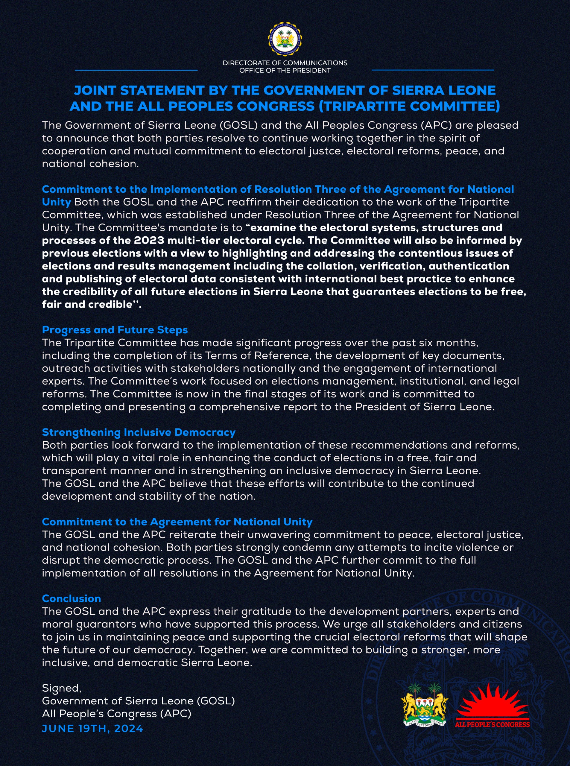In a significant move towards electoral reform and national unity, the Government of Sierra Leone (GOSL) and the All Peoples Congress (APC) have issued a joint statement outlining their commitment to cooperation and electoral justice.