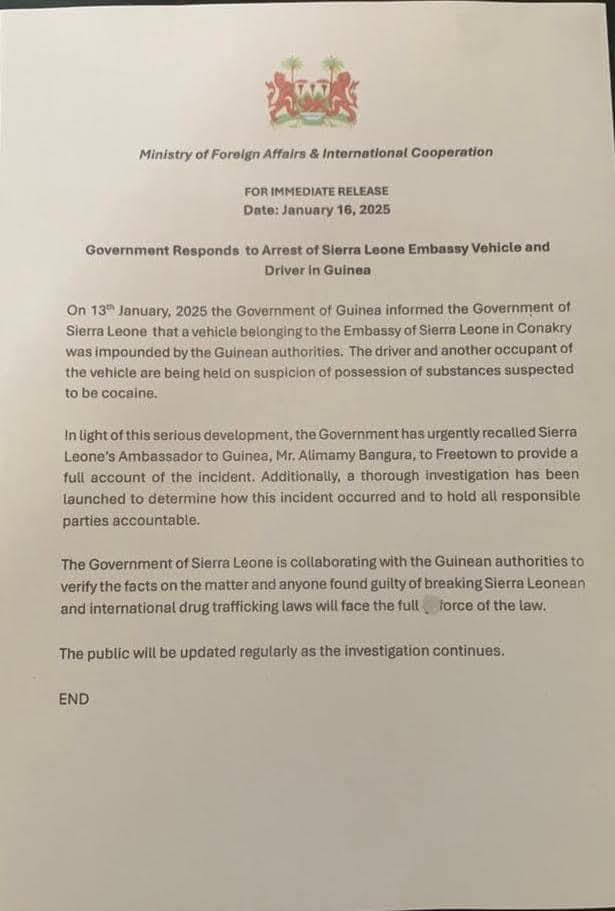 The Government of Sierra Leone through the Ministry of Foreign Affairs and International Cooperation has responded swiftly to the arrest of a vehicle belonging to its Embassy in Conakry, Guinea, along with the detention of its driver and another occupant on suspicion of drug trafficking.