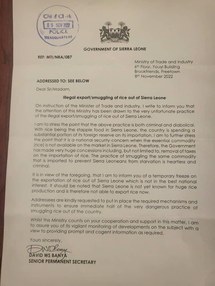 According to the letter, this decision was taken by the Ministry of Trade and Industry due to the practice of export/smuggling of rice out of the country.
