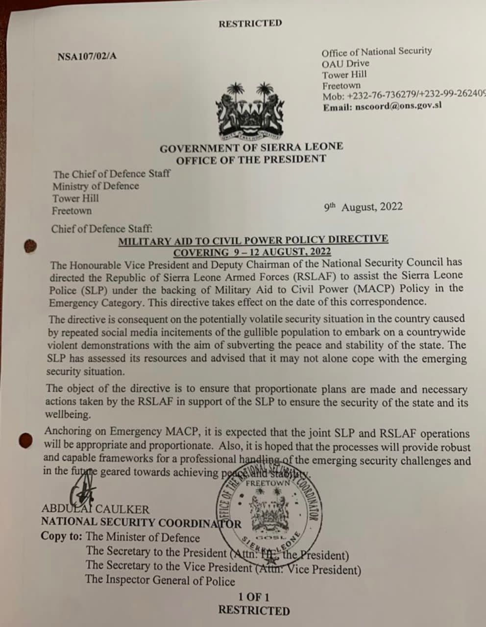 “The Government of Sierra Leone, The Honourable Vice President and Deputy Chairman of the National Security Council has directed the Republic of Sierra Leone Armed Forces (RSLAF) to assist the Sierra Leone Police (SLP) under the backing of Military Aid to Civil Power (MACP) Policy in the Emergency Category. This directive takes effect on the date of this correspondence.
