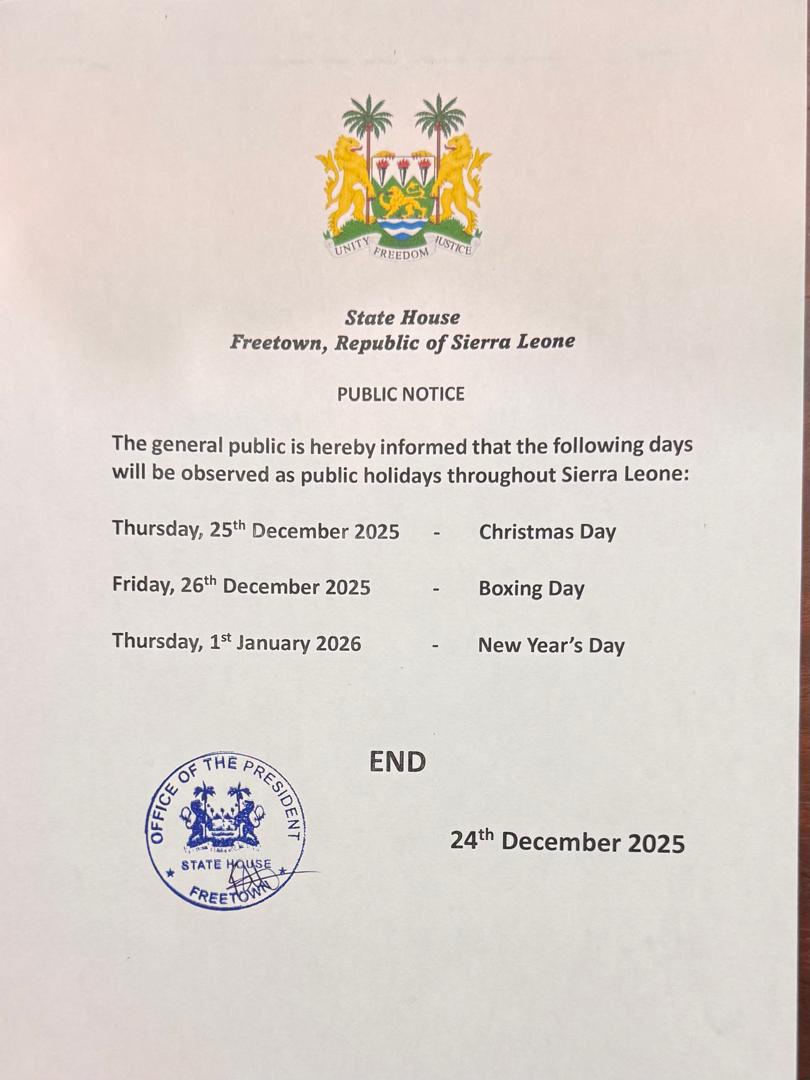 According to a public notice issued by State House in Freetown, 25 December 2025 will be observed as Christmas Day, 26 December 2025 as Boxing Day, and 1 January 2026 as New Year’s Day.