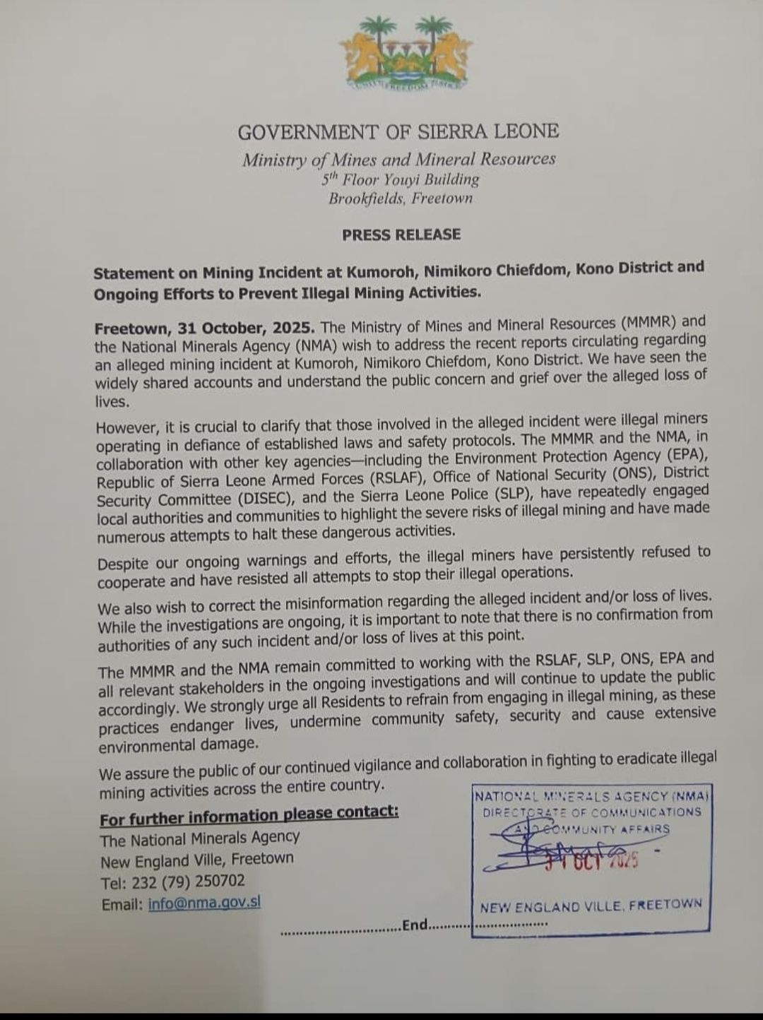 The Ministry of Mines and Mineral Resources (MMMR) and the National Minerals Agency (NMA) have broken their silence on widely circulating reports of a deadly mining incident in Kono District, stating that there is no official confirmation of any loss of life.