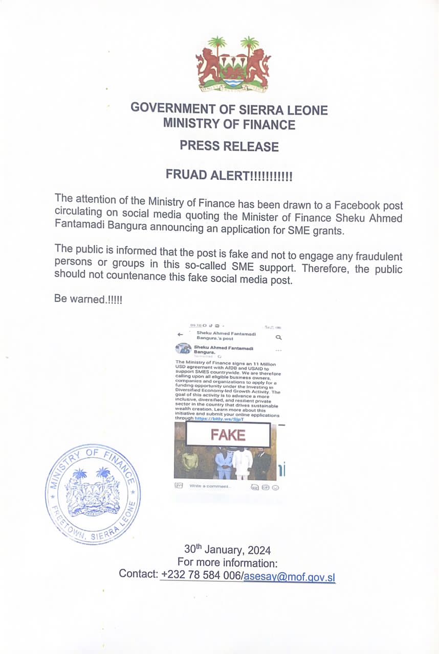 In an official press release, the Government of Sierra Leone, through the Ministry of Finance, has addressed a circulating Facebook post claiming that Minister of Finance Sheku Ahmed Fantamadi Bangura announced an application for SME grants.