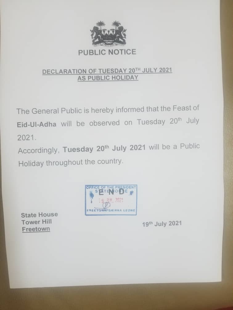 The Government of Sierra Leone has declared Tomorrow Tuesday, July 20, 2021, to be a Public Holiday throughout the country.