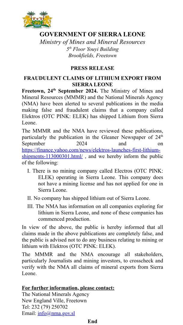 The Government of Sierra Leone, through the Ministry of Mines and Mineral Resources (MMMR) and the National Minerals Agency (NMA), has issued a firm denial regarding recent media claims that a company, Elektros (OTC PINK: ELEK), has exported lithium from Sierra Leone.