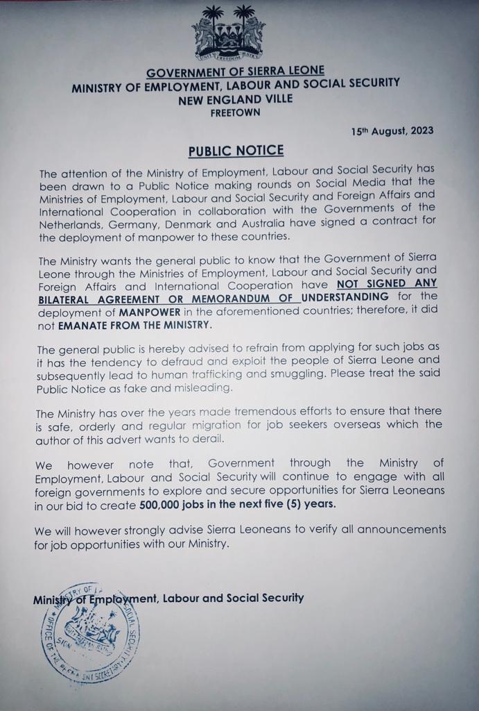 The Ministry of Employment, Labour and Social Security has issued a public notice clarifying that no bilateral agreement or memorandum of understanding has been signed between Sierra Leone and the governments of the Netherlands, Germany, Denmark, or Australia for the deployment of manpower to these countries.