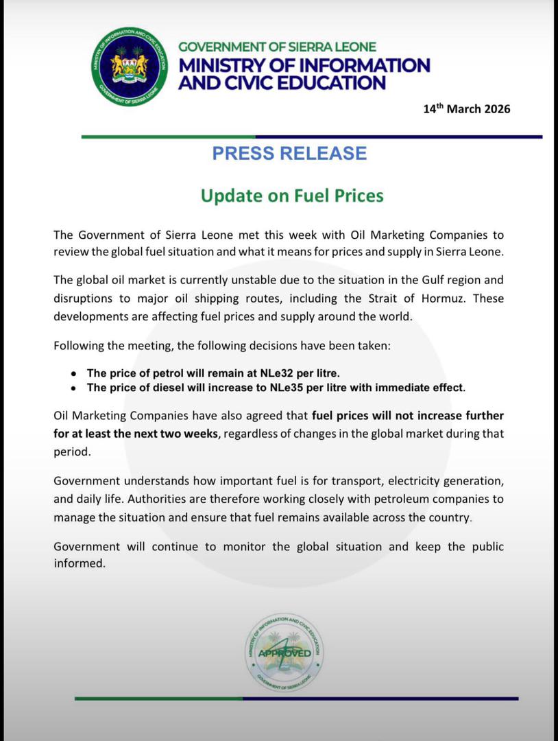 The ministry added that the government will continue to monitor developments in the global oil market and keep the public informed about any future changes that may affect fuel prices or supply in Sierra Leone.